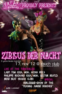 Freaks-Hairclub präsentiert den Zirkus der Nacht! Insane-Clowns, Burlesque Tänzerinnen und sagenumwobene Kreaturen werden auf der Bühne ihr Unwesen treiben. Lasst euch verführen vom Sog der Nacht und tanzt euch die Schuhsohlen weg zu den Göttern der Dunkelheit hinter den Dj-decks. Harte und knallende Bässe werden euch geboten von den Hardstyle-heroes aus der Schweiz Lady Tom + Philippe Rochard und unserem Ländle Techno Artist Brad Beat. Am 17.11.2012… wird im Rauch Club Feldkirch die Luft zum Kochen gebracht. …midnight bell is ringin… …distorted circusmusic…. freaks-hairclub presents the midnight circus! insane clowns, burlesque-dancers and legendary creatures will be upon the stage. let yourself be seduced by the night and dance like hell to the music from the gods of darkness behind the decks. hard and banging beats gonna be played from the swiss hardstyle heroes lady tom + philippe rochard and from the local area techno artist brad beat. on 17.11.2012 the rauch club will have an explosive atmosphere.