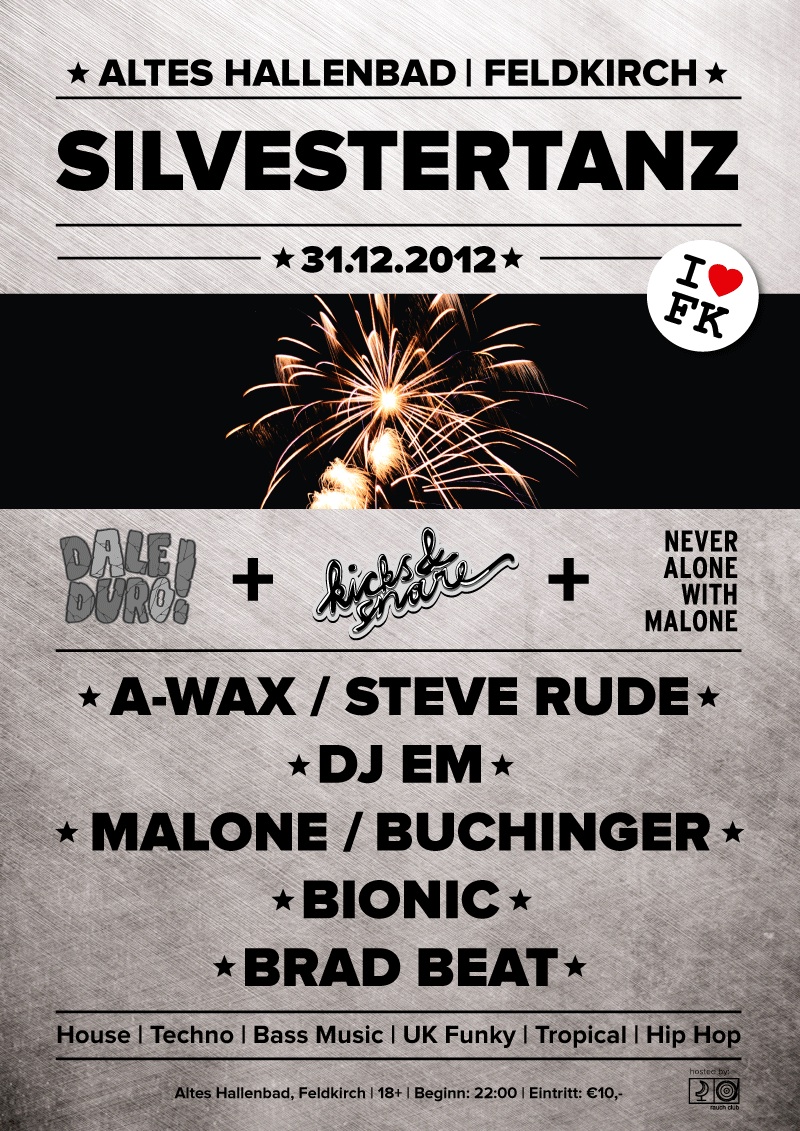 Das alte Jahr ist schon fast Vergangenheit – aber eben nur fast! Auf alle Fälle bleibt noch genügend Zeit, zum krönenden Abschluss nochmal ordentlich nicht nur sprichwörtlich die Korken knallen zu lassen! Auch dieses Jahr steigt im Alten Hallenbad die wahrscheinlich beste, zumindest aber die wohl letzte Party des Jahres 2012! Für Jede/n ist das Richtige dabei! Während im Pool zu den heissen Rhythmen und Beats der Dale Duro! – Jungs A-Wax und Steve Rude, und Mr. Kicks’n’Snare himself DJ EM die Hüften geschwu